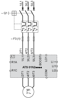 A1 :Soft start/soft stop unit(1)For type 2 coordinationQ1 :Motor circuit-breakerF3 :3 fast-acting fuses