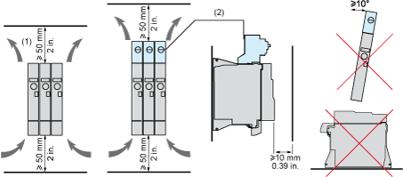 (1)Minimum value corresponding to thermal constraints. A 150 mm clearance may help to connect the ground.(2)Optional GV2 circuit-breaker