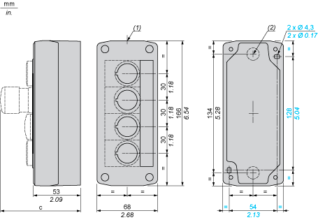 (1)2 knock-outs for Pg 13.5 cable gland, maximum capacity 12 mm/0.47 in.(2)Knock-out for cable entry, maximum capacity 14 mm/0.55 in.