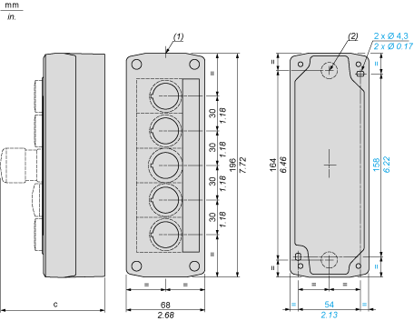(1)2 knock-outs for Pg 13.5 cable gland, maximum capacity 12 mm/0.47 in.(2)Knock-out for cable entry, maximum capacity 14 mm/0.55 in.