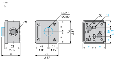 (1)4 ISO 20 knock-outs.(2)2 knock-outs for cable entry, maximum capacity 16 mm / 0.63 in.(3)2 knock-out elongated fixing holes Ø 3 mm x 5 mm / Ø 0.12 in. x 0.20 in.