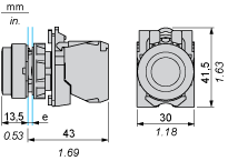 (1)Diameter on finished panel or support(2)For selector switches and Emergency stop buttons, use of an anti-rotation plate type ZB5AZ902 is recommended.(3)Ø22.5 mm recommended (Ø22.3 0+0.4) / Ø0.89 in. recommended (Ø0.88 in. 0+0.016)