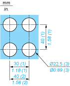 (1)Minimum value.(2)40 mm/1.58 in. for Emergency switching off pushbutton only.(3)Standard value: Ø 22.3 (0; + 0.4) mm/Ø 0.88 (0; + 0.02) in.