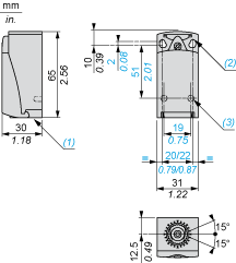(1)Tapped entry for M16 x 1.5(2)2 elongated holes Ø 4.3 x 6.3 mm on 22 mm centres, 2 holes Ø 4.3 on 20 mm centres.(3)2 x Ø 3 holes for support studs, depth 4 mm.