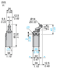 (1)1 tapped entry for M20 x 1.5(2)Ø: 2 elongated holes Ø 4.3 x 6.3 on 22 mm centres, 2 holes Ø 4.3 on 20 mm centres.