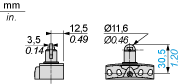 (1)Tapped entry for M16 x 1.5(2)4 elongated holes Ø 4.3 x 6.3 mm on 22/42mm ctrs, 4 holes Ø 4.3 on 20/40 mm ctrs.(3)2 x Ø 3 holes for support studs, depth 4 mm.