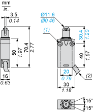 (1)2 fixing holes Ø 4.2 mm, counterbored Ø 8 mm by 4 mm deep.(2)External diameter of cable 7.5 mm.