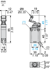 (1)2 fixing holes Ø 4.2 mm, counterbored Ø 8 mm by 4 mm deep.(2)External diameter of cable 7.5 mm.