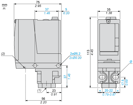 (1)1 fluid entry, tapped G1/4 (BSP female)(2)1 electrical connections entry, tapped Pg 13.5Ø :2 elongated holes Ø 5.2 x 6.7