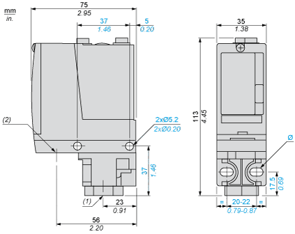 (1)1 fluid entry, tapped G1/4 (BSP female)(2)1 electrical connections entry, tapped Pg 13.5Ø :2 elongated holes Ø 5.2 x 6.7