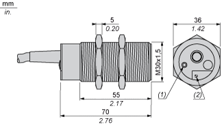 (1)LED(2)Potentiometer beneath protective flap