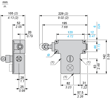 (1)3 plain holes for Pg 13.5 cable gland.(2)Maximum extension.Ø4 elongated holes Ø 6 mm/0.24 in.
