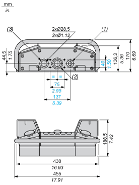 (1)2 plain holes for n° 13 (PG13.5) or ISO M20 cable gland.(2)Ø 56 mm/Ø 2.20 in. knock-out specifically for mounting on pedestal.(3)1 plain hole for n° 21 (PG21) cable gland. For ISO M25, use adaptor DE9RA2125 and fixing nut DE9EC21.