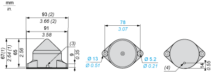 (1)Knock-out for wire routing, maximum capacity 14 mm/0.55 in.(2)With seal(3)Radial cable route(4)Axial cable route