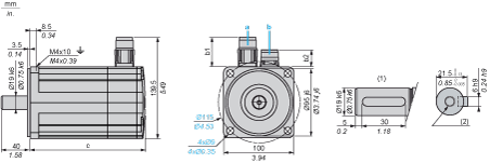 a:Power supply for servo motor brakeb:Power supply for servo motor encoder(1)Shaft end, keyed slot (optional)(2)For screw M6 x 21 mm/M6 x 0.83 in.