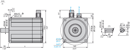 a:Power supply for servo motor brakeb:Power supply for servo motor encoder(1)Shaft end, keyed slot (optional)(2)For screw M8 x 25 mm/M8 x 0.98 in.